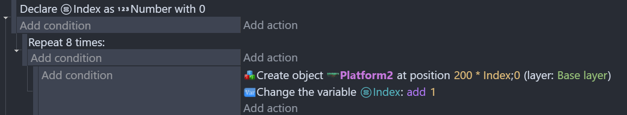 Local variables can also be used within a loop, but in this case its value is reset at every repetition. For instance, the following events create 8 platforms overlapping each other.