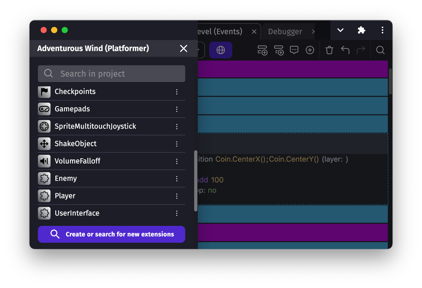 Similarly to scenes or external events, functions are written with events. They allow to create new conditions, new actions and new expressions that add up to GDevelop features. They are a good way to organize events, avoid duplication and share features with the community.