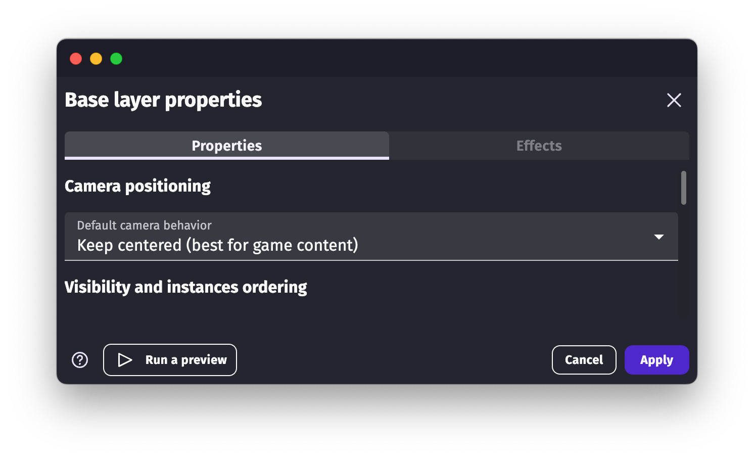 - The camera of the layer stays centered when the game window is resized. This is usually useful for game content or menus