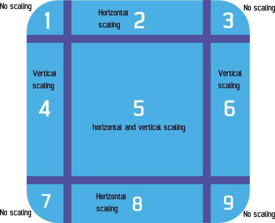 The texture is split into 9 segments, 1 to 9. Each of those segments will be scaled separately. Segments 1, 3, 7, and 9 keep their size and are not scaled, while segments 2 and 8 get scaled only horizontally, 4 and 6 get scaled only vertically, and segment 5 gets scaled both horizontally and vertically. Segments 2, 4, 5, 6, and 8 may repeat instead of scaling based on the panel sprite's object properties settings.